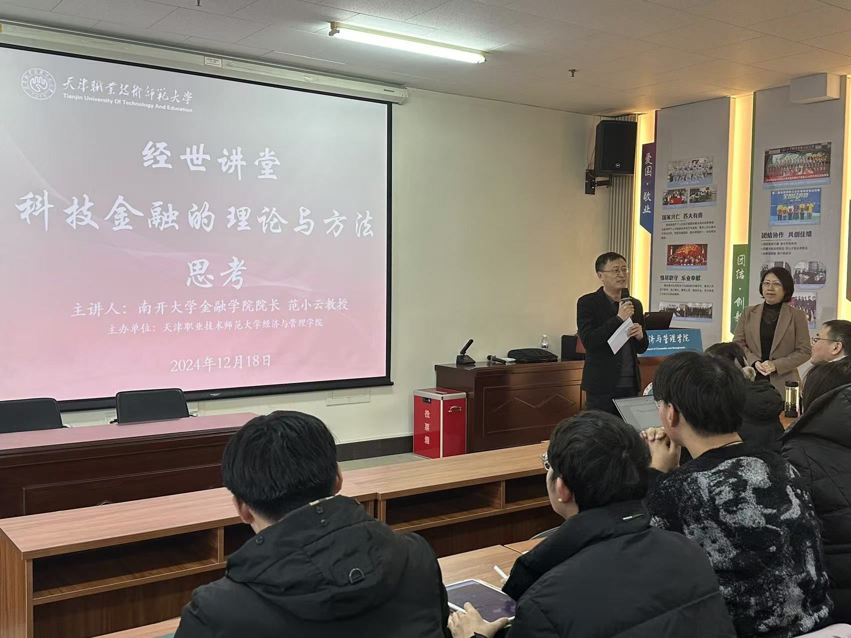 在第一教学楼701室举办“经世讲堂”第九讲,邀请南开大学金融学院院长、全国政协委员范小云教授作“科技金融的理论与方法思考”主题讲座。讲座由副院长董树功主持,部分教师和金融专业研究生参加。