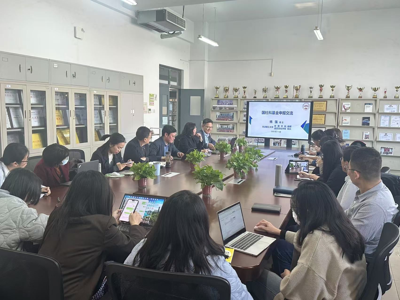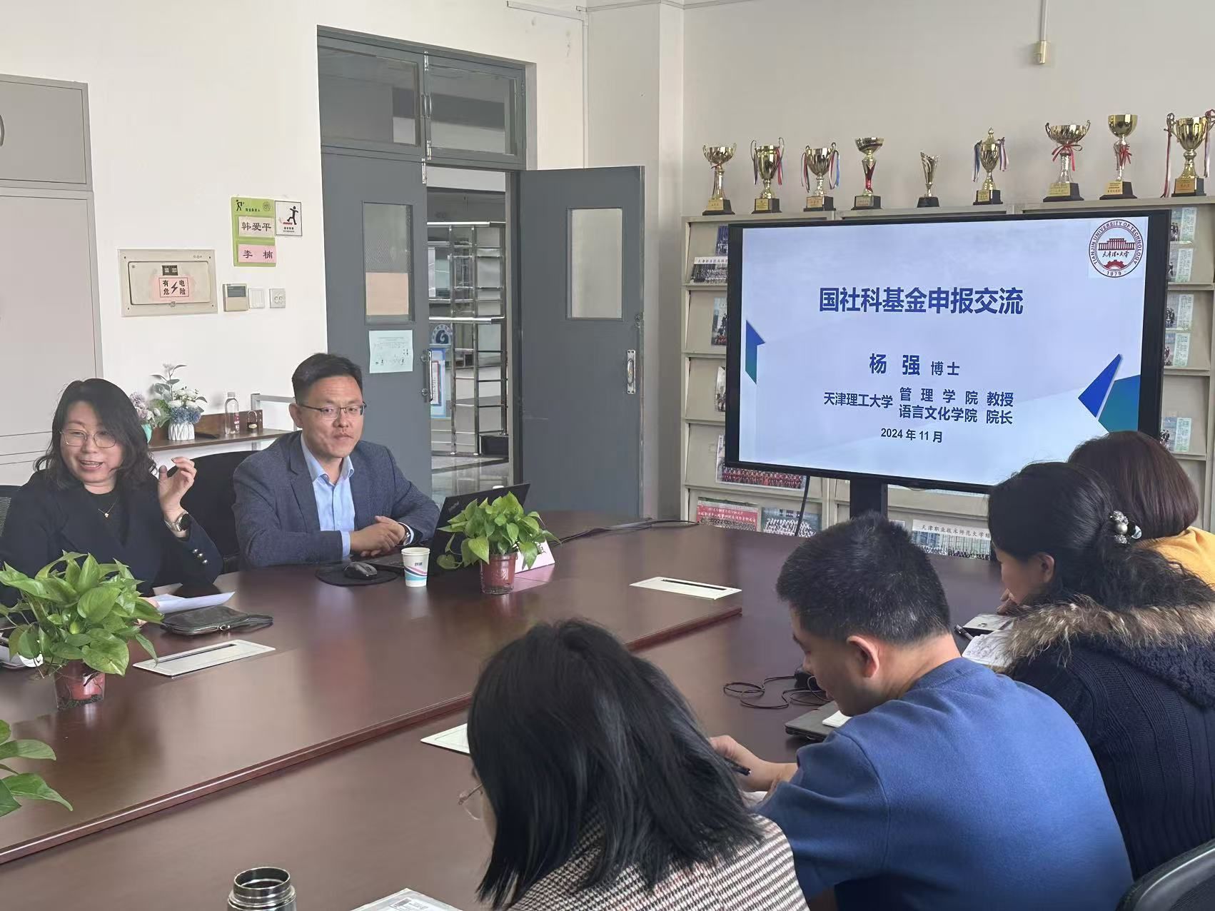 在A710举办“经世讲堂”第八讲,邀请天津理工大学语言文化学院院长、管理学院教授杨强分享国家社科项目申报经验。会议由院长齐莉丽主持,副院长董树功、齐旭高、部分专任教师及研究生参会。