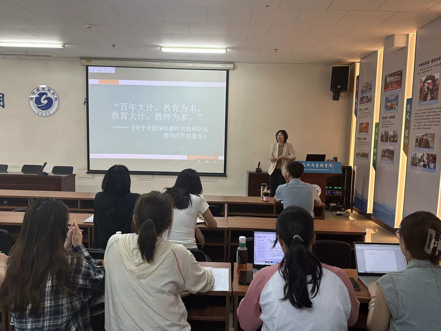 范蓉教授详细梳理了“双师型”教师队伍建设在不同时期的制度发展演变,分享了天津市第一商业学校开展“双师型”教师队伍建设的实践经验,阐述了新时代背景下对“双师型”教师的新要求。她指出,教师队伍是发展职业教育的第一资源,是支撑新时代职业教育改革的关键力量,建设高素质“双师型”教师队伍是加快推进职业教育现代化的基础性工作。她鼓励同学们要勤于学习、勇于实践、敢于创新,不断强化理论知识与实践能力、提升专业素养与职业能力,努力成为兼具理论教学和实践教学能力的复合型人才。她表示,欢迎同学们到天津市第一商业学校进行教育实习、应聘相关教师岗位。