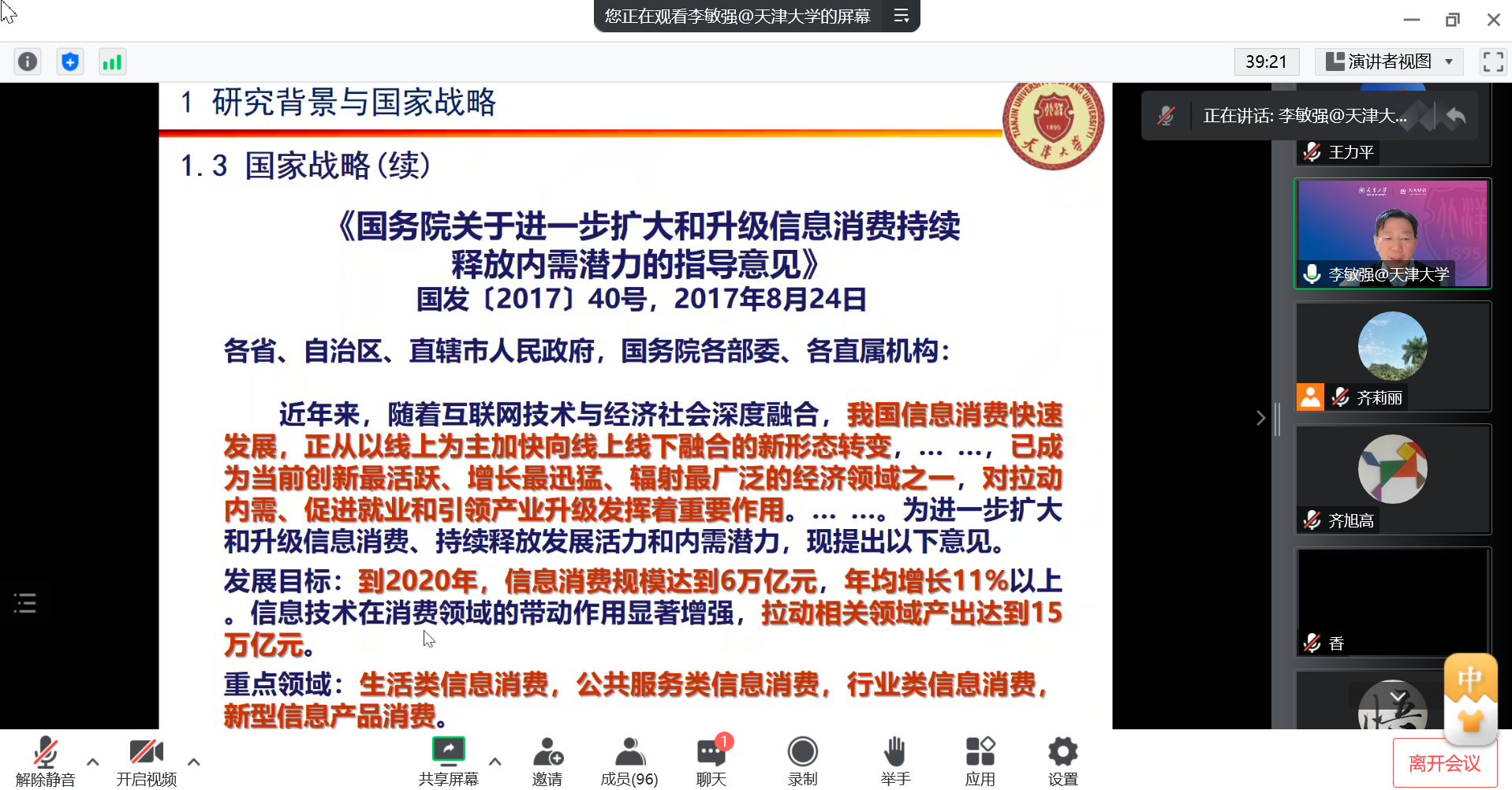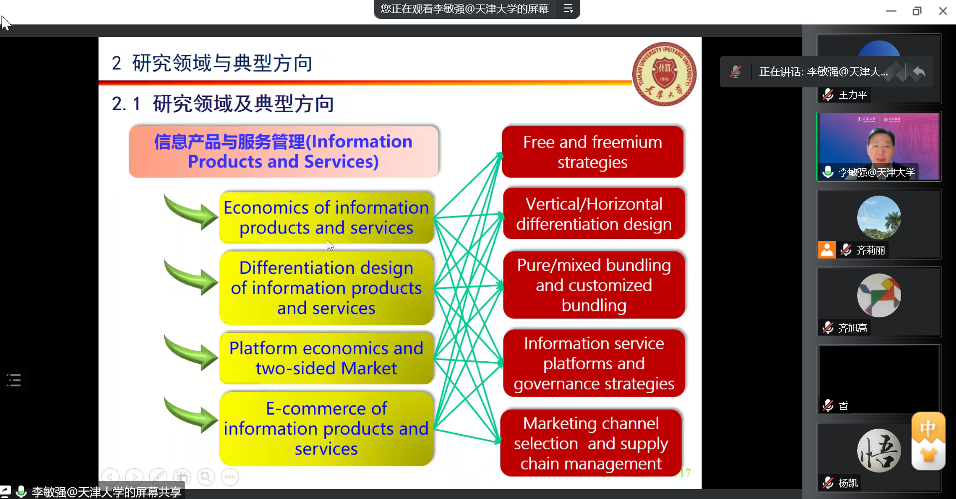 会上,李敏强结合国家社会科学基金重点项目,向与会人员分享其最新研究成果——《移动互联网信息服务和信息内容企业的协同运营创新:需求、治理和收益》。指出该研究应用博弈论方法和模型,分析了移动信息服务与信息内容市场竞争情形下的企业策略选择及合作均衡。重点针对移动运营商和内容提供商达成数据补贴计划的市场条件、订阅收益模式内容提供商是否应该采纳数据补贴计划、存在跨边网络效应情形下移动运营商是否应该推出数据补贴计划等科学问题,综合讨论了基于“数据补贴计划”移动运营商和内容提供商的策略选择及价格博弈。同时,还还和大家就论文研究方法和课题申报选题等进行了深入交流,使学院师生受益匪浅。