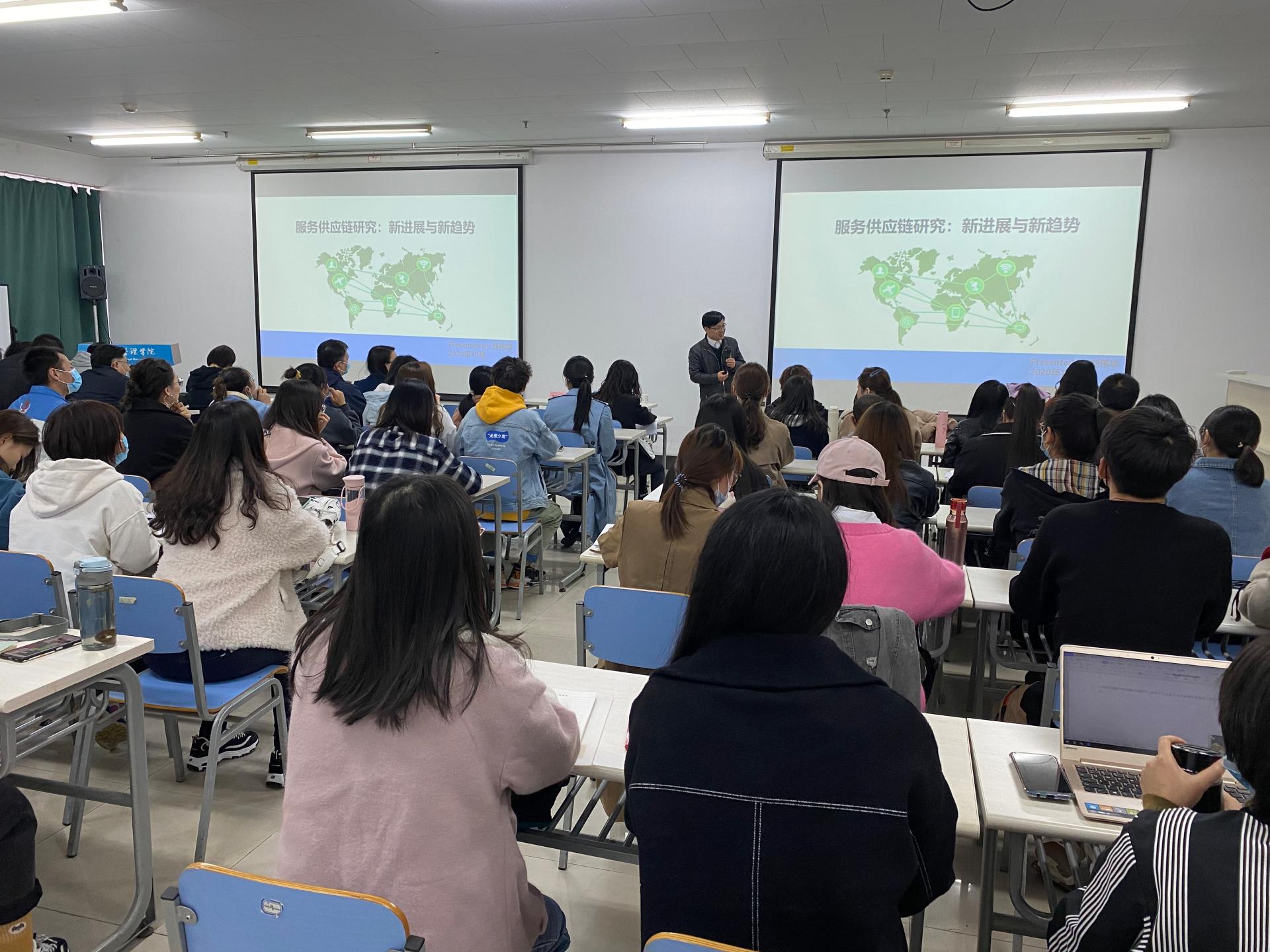 会上,刘伟华教授结合自身实践经验和研究成果,将理论与实际相联系,以菜鸟、跨境电商、携程旅行等为例,向大家介绍了“服务供应链”的研究背景,从服务需求管理、服务供应管理以及服务供应链协调三个角度分析当前服务供应链存在的问题及主流的研究内容,结合服务供应链的研究趋势指出未来的研究机会及挑战。报告会赢得了在场师生的热烈响应,在互动环节,刘教授耐心详细地解答了现场师生的提问。
