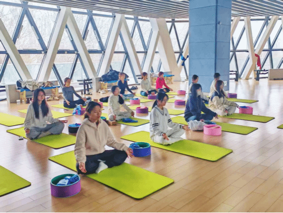 随后,任楠老师以“渐进式体验”为路径,分层次指导学生进行基础体式训练。从“腹式呼吸法”的节奏调控,到各种体式的舒展,参与者们在柔和的音乐中逐步掌握动作要领。活动现场,学生们凝神聚气、舒展肢体,于动静相宜间感受肌肉的拉伸与心灵的放松。