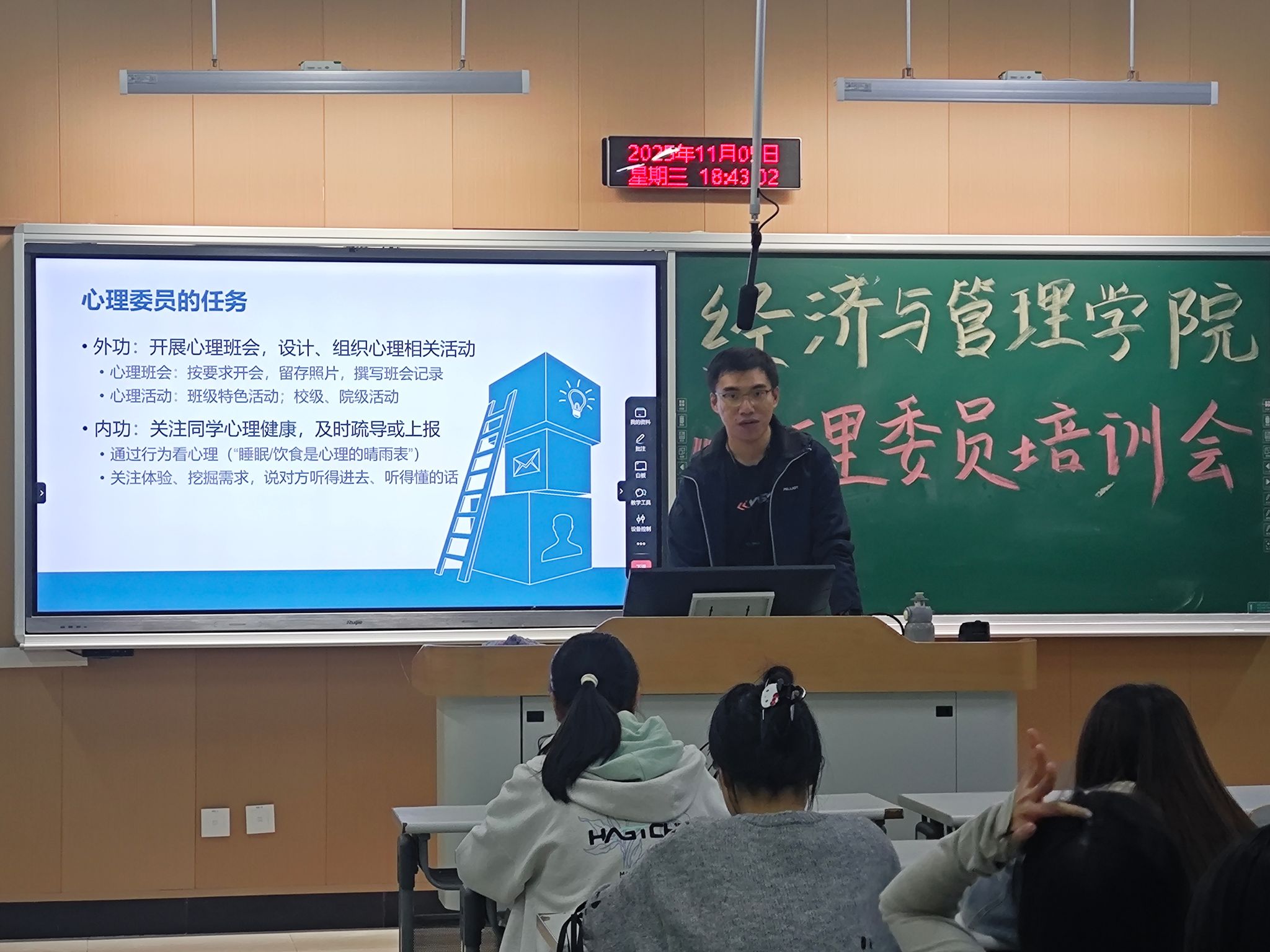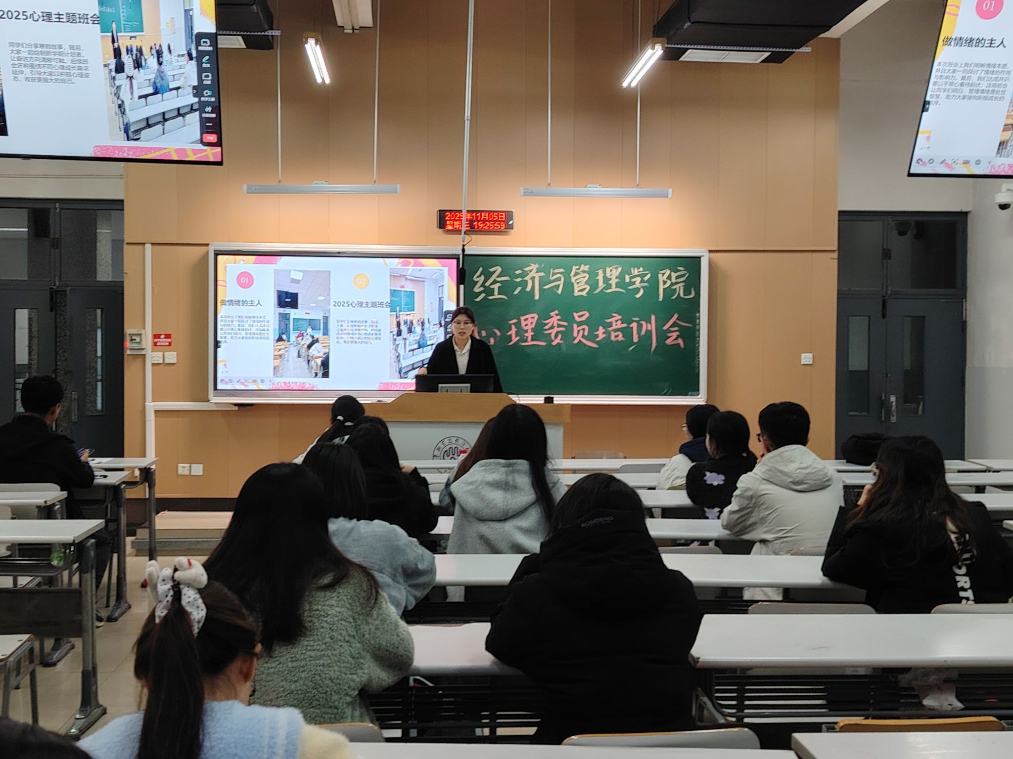 举办心理委员工作培训暨心理“达标”“示范”班建设经验交流会。25级全体新生心理委员及高年级心理委员代表参会。会议由学院辅导员刘欣宇主持。