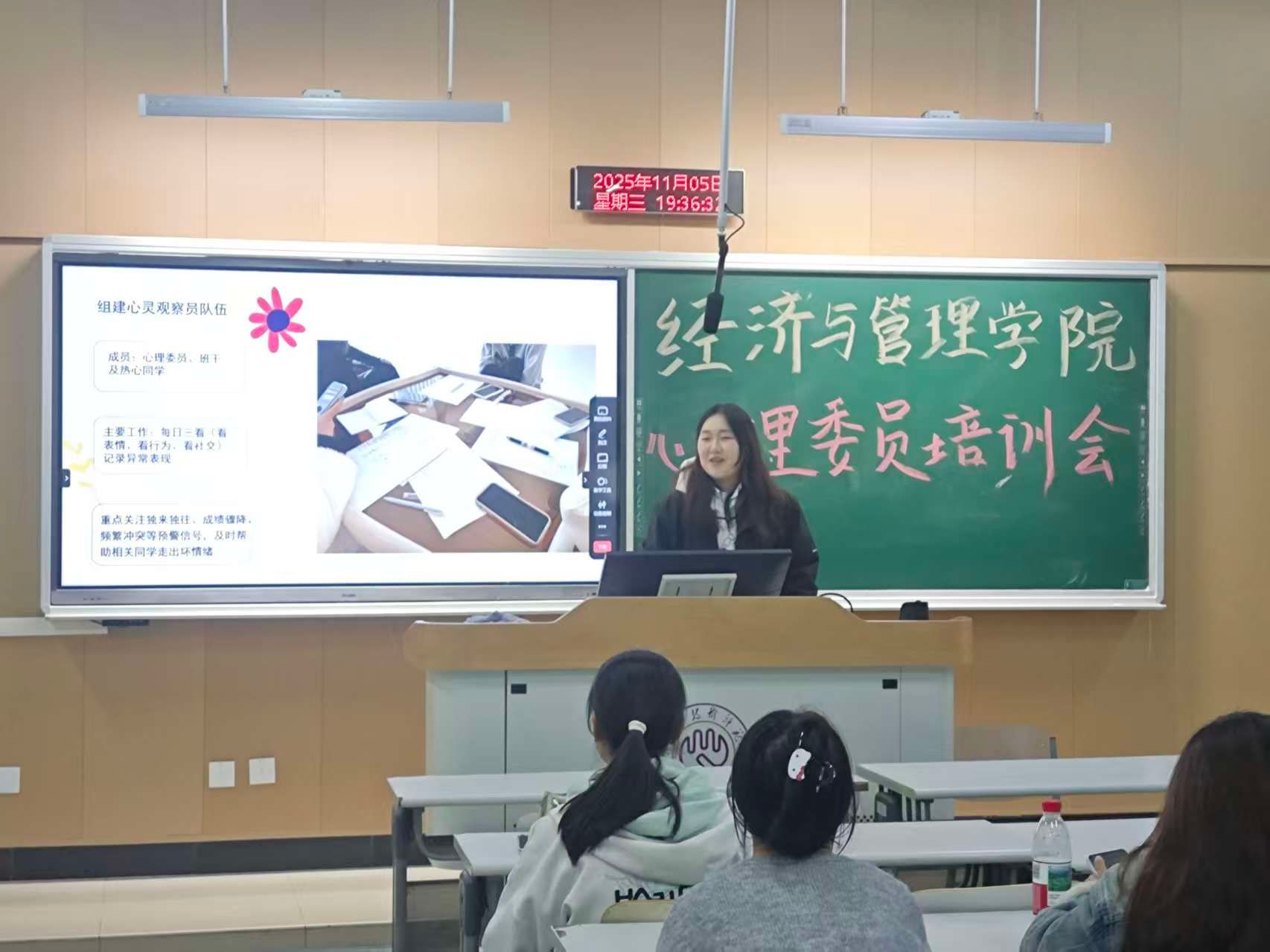 在经验分享环节,学院心语社社长王雅雯、副社长任柄桦结合“达标”“示范”班建设经历,分享了策划特色心理活动与组织心理班会的经验,详细介绍了活动从设计到落地的全过程,讲解了提升班会质量的具体方法,以真实案例生动诠释了心理活动对疏导压力、增强班级凝聚力的重要作用。现场心理委员认真记录,学习氛围浓厚。