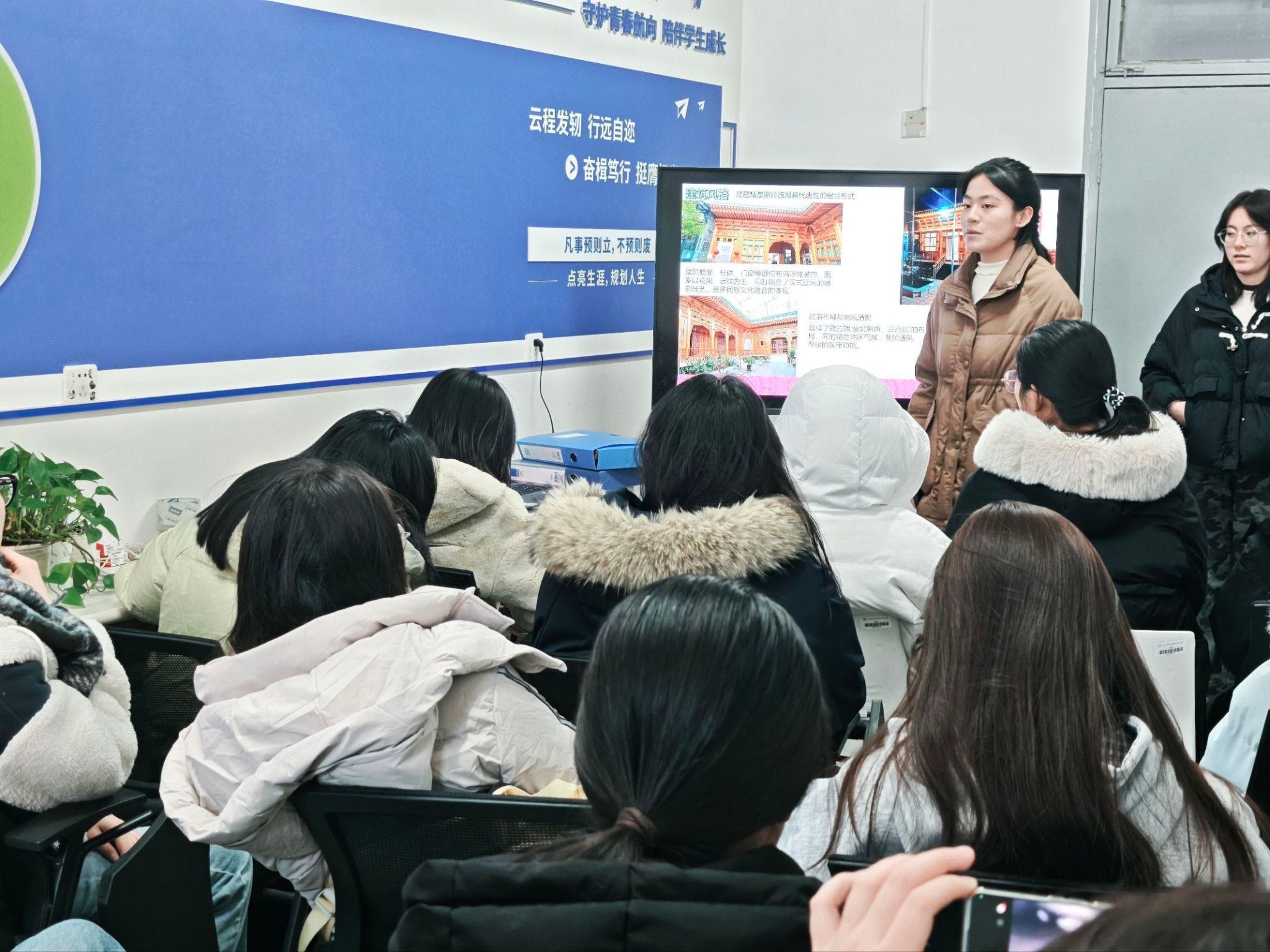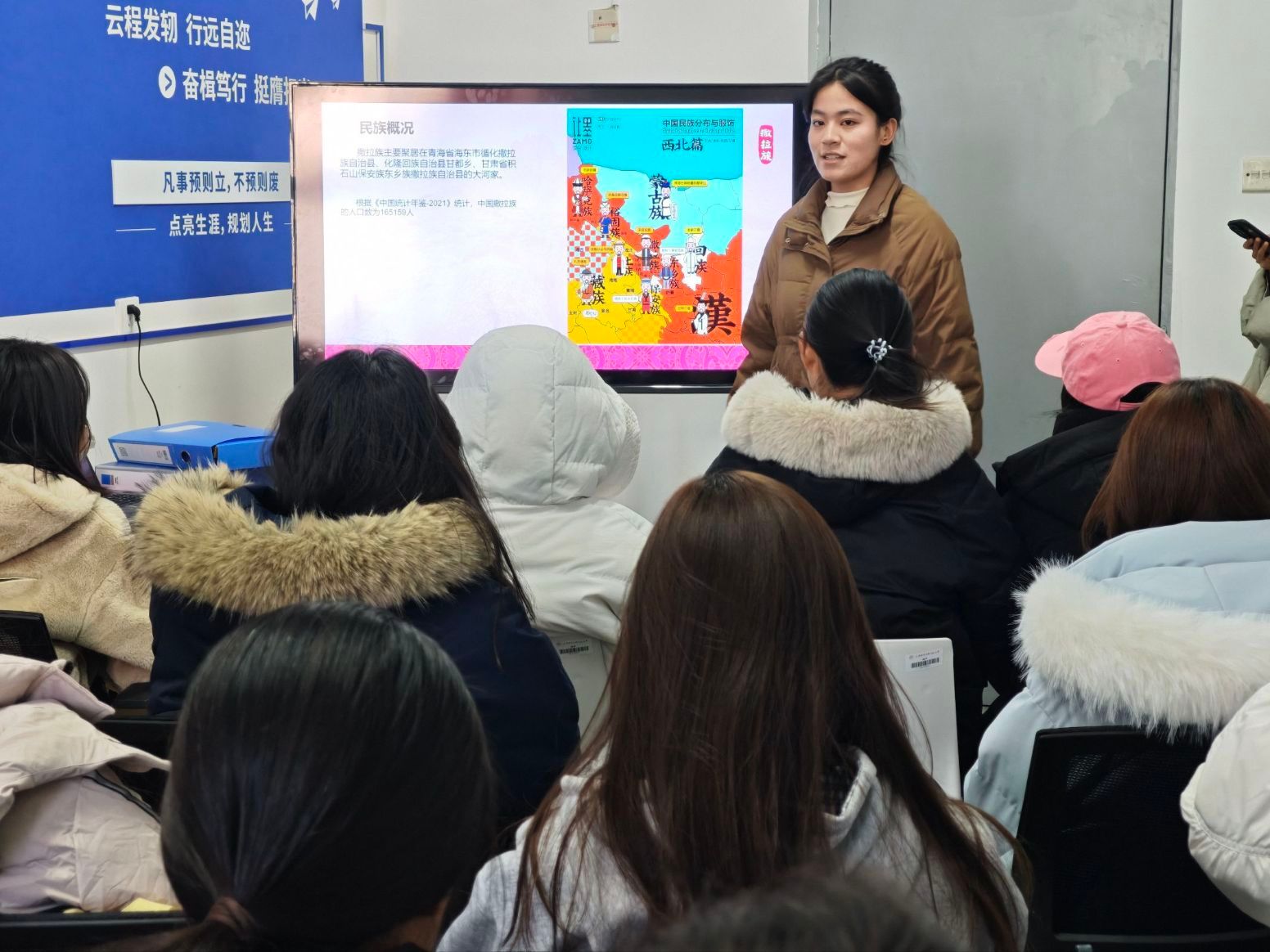 分享会上,马媛媛以“从中亚到西北的千年迁徙”为主线,系统梳理了撒拉族的历史渊源。在文化介绍环节,她重点展现了撒拉语作为阿尔泰语系突厥语族语言的独特魅力与兼容特质;通过盖碗茶、手抓肉等特色饮食,勾勒出游牧与农耕结合的生活方式缩影;以琵琶楼民居的建筑风格,呈现多民族艺术交融的印记。此外,她还分享了撒拉族特色节日与传统婚俗,让同学们直观感受其中“团结”“友善”“感恩”的核心文化精神。