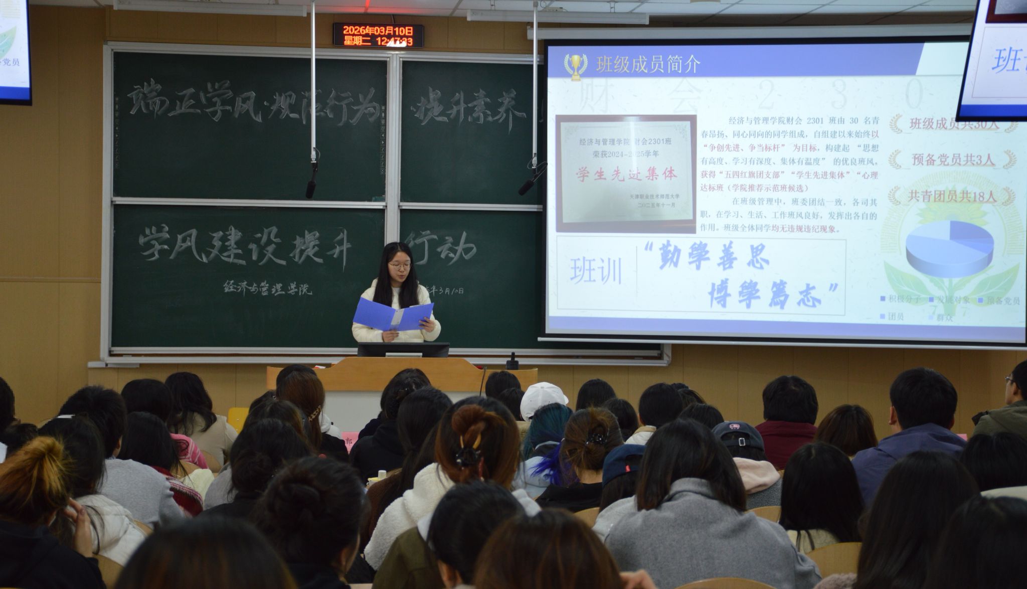 会上,院学工办主任、团委书记闫丹首先介绍了学风建设提升行动的整体安排,明确了本次行动的核心目标与工作重点,本次学风建设提升行动面向全院学生开展,将通过召开主题班会、开展学习习惯打卡、举办优秀学习笔记展示大赛、强化考勤抽查、发布学风倡议书、开设考研自习室等一系列举措,多维度、全方位加强学风建设,规范学生学习行为,提升学生学习素养。辅导员郭亚心详细解读了本次行动的核心特色活动,强调了学生骨干在学风建设中的重要作用,鼓励学生骨干带头参与,做好班级、社团的宣传与组织工作,带动全院同学积极投身学风建设。随后,2025年校级“优良学风”班财会2301班、信管2401班代表依次上台,分享了班级学风建设的特色经验与实践做法,为各班级打造专属学风亮点提供了有益借鉴。
