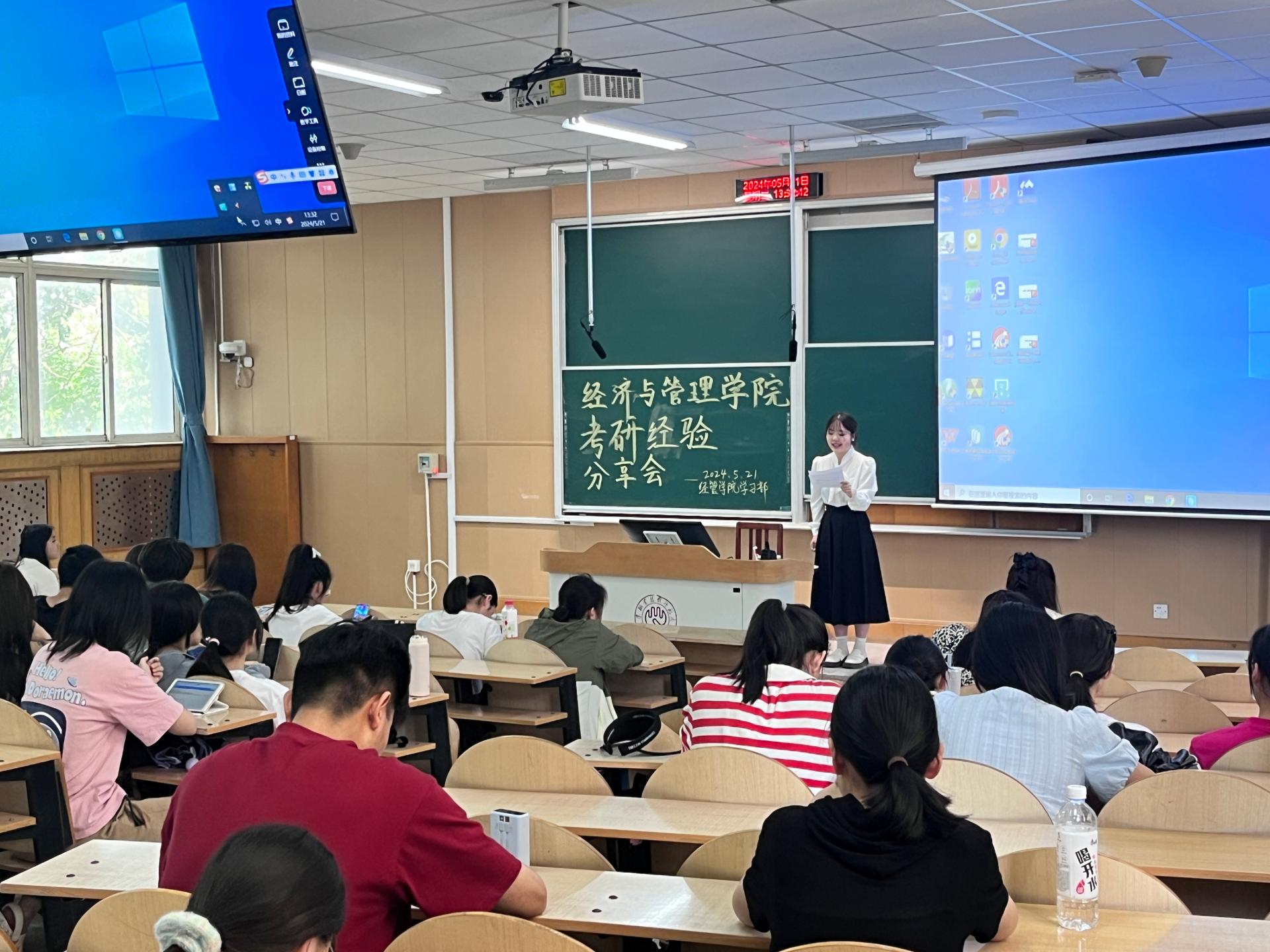 在阶教201教室举办“丁香花开‘研’路芬芳”考研经验分享会,邀请何雨霜、龚晟峰、张紫彤、王佳琪、丁晓菲、王佳等六名优秀考研学生代表分享备考经验。辅导员李丹慧主持会议,百余名2025届考研学生参会。