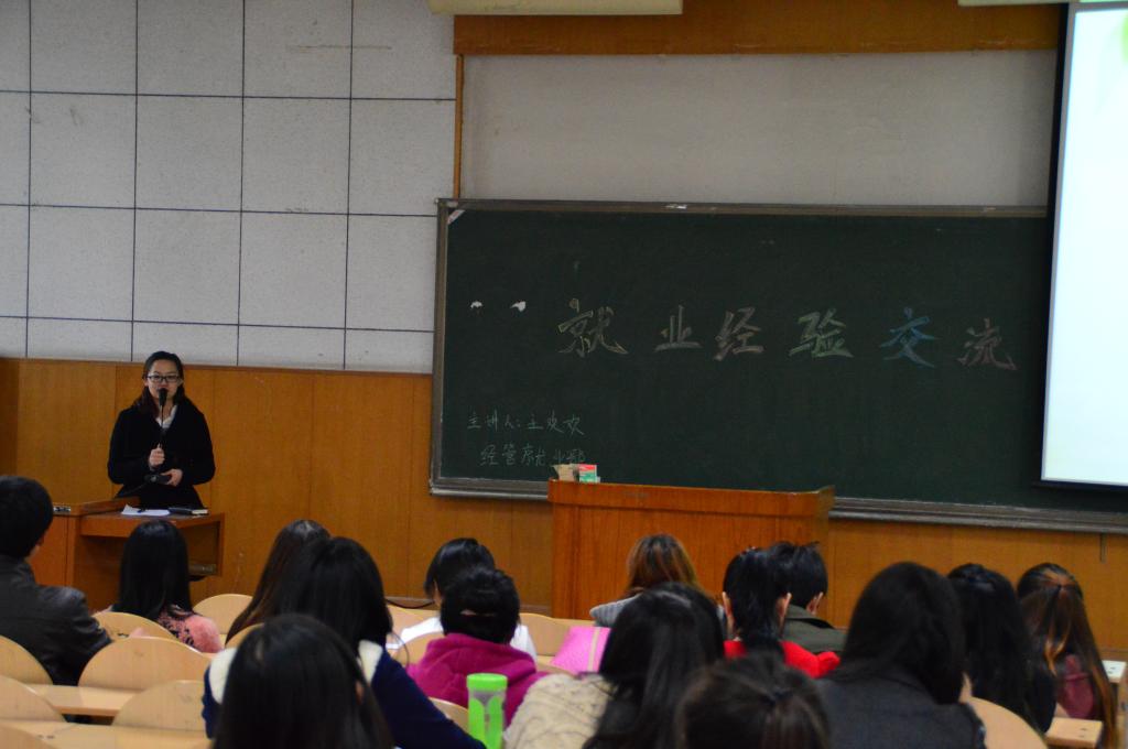 二是举办毕业生经验交流会。11月5日,经管学院在阶二201教室举办毕业生经验交流会。交流会邀请2009级优秀毕业生、在蓝月亮集团天津分公司就职的王欢欢,就大学生活的真切感受和工作后的经验教训与同学们进行热烈交流。交流会上,王欢欢同学结合自己的经历及当前就业形势,就如何选择未来发展方向、如何提升自身综合能力以及如何制作简历、如何注意面试细节等提出了中肯的建议。整场交流会气氛活跃、内容充实、效果良好。