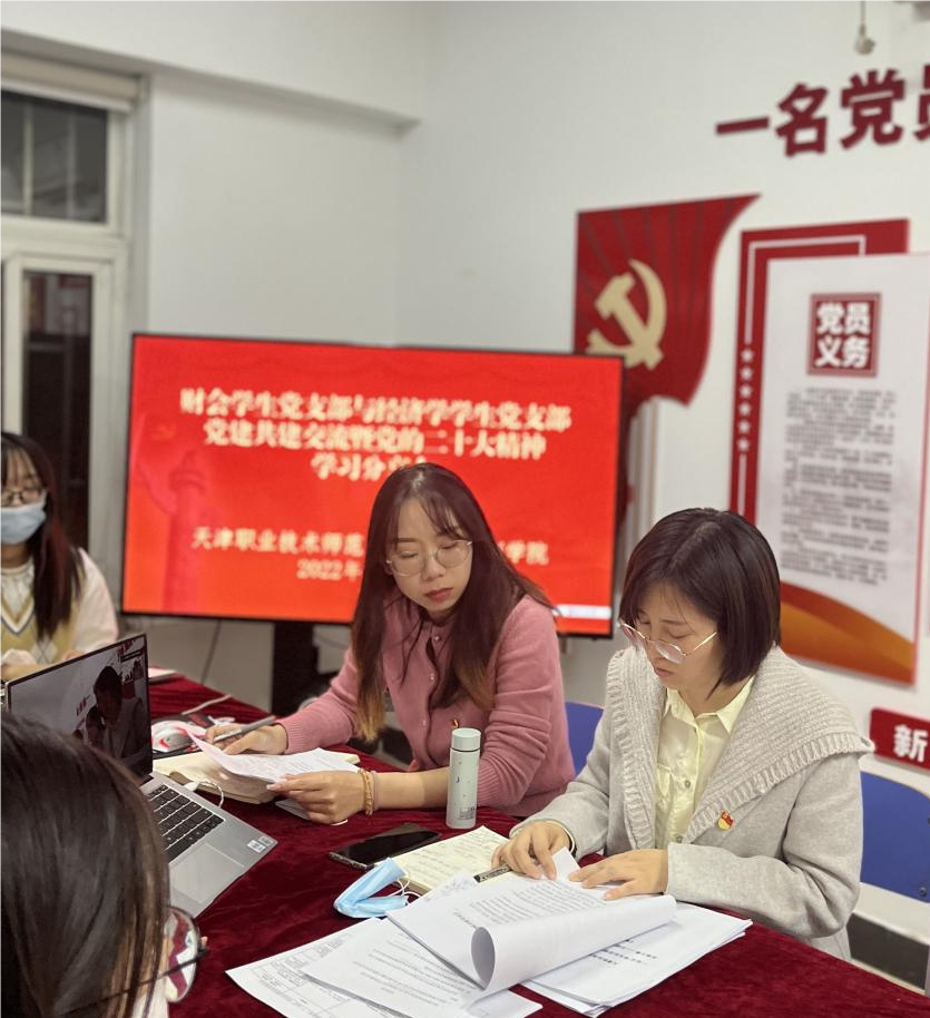 与会人员围绕“学习贯彻党的二十大精神”主题,结合学生党员实际开展深入交流。财会学生党支部党员段成妮表示,作为一名师范专业学生,她将以党的二十大代表玛日耶姆古丽·吾布力喀斯木老师为榜样,牢记初心使命,提升技能本领,投身职业教育发展,让青春在奉献中焕发光彩;天津天狮学院学生党员王毅表示作为学生党员,要努力学习,不负韶华,为国家的发展贡献绵薄之力,燃烧赤子之心。双方的学生党员们纷纷表示,将立志做有理想、敢担当、能吃苦、肯奋斗的新时代好青年,在新征程上激昂青春之志,奉献青春之力,绽放青春之花。