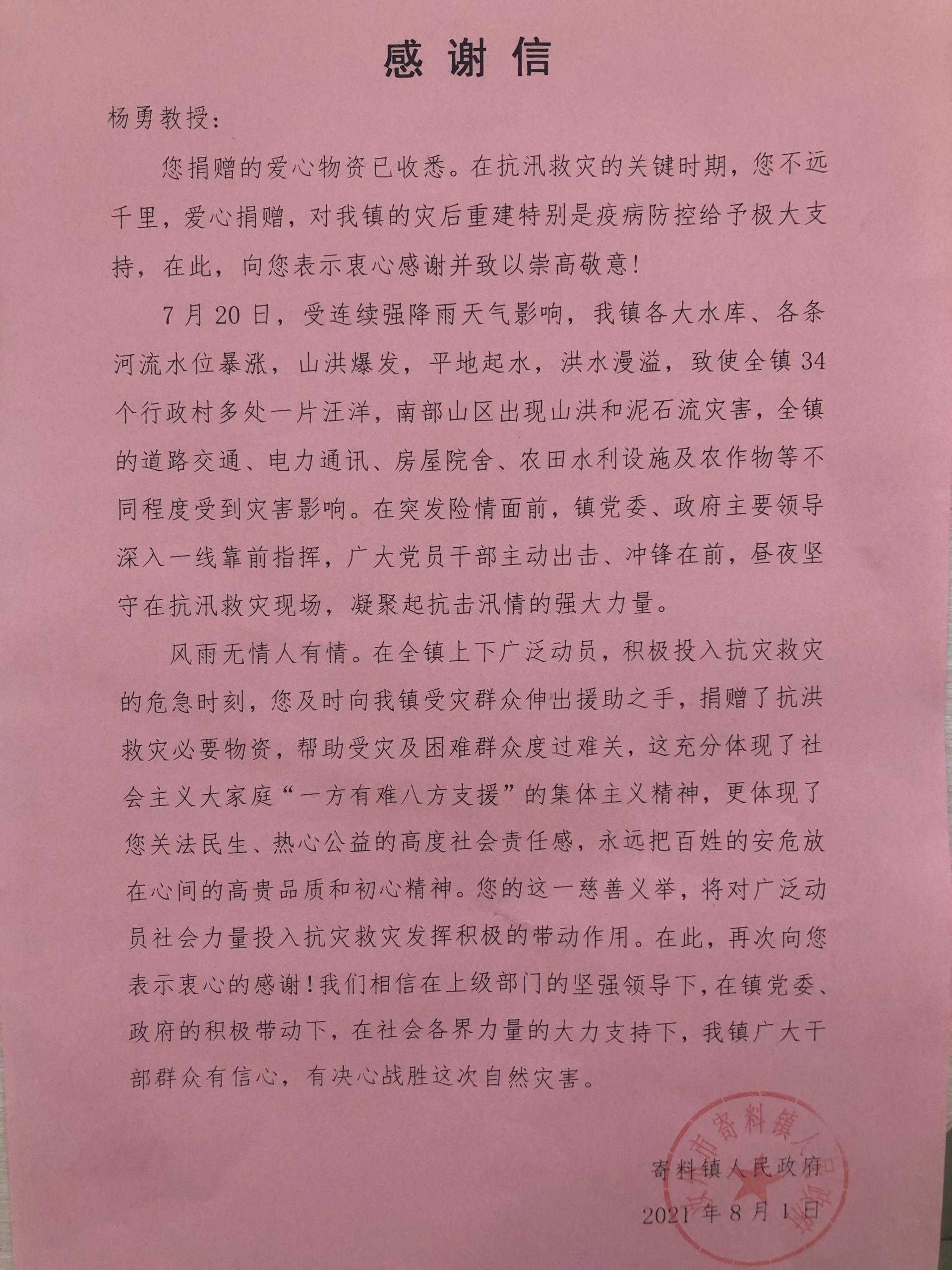 近日,学校收到了一封来自河南省平顶山市寄料镇人民政府的感谢信,感谢洪爷