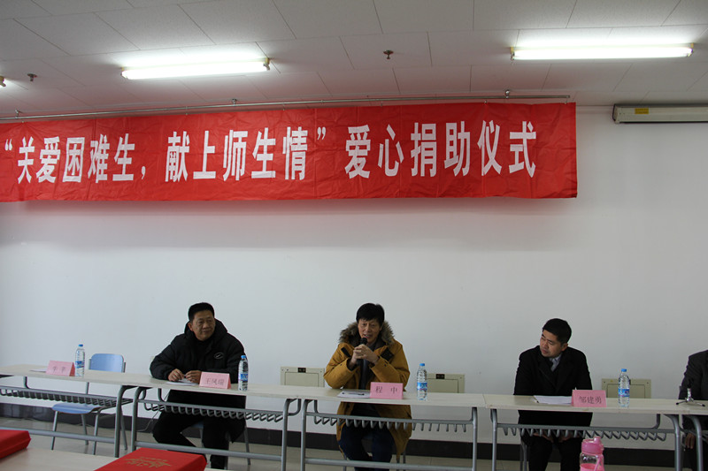 12月12日,经管学院在A楼701报告厅举行了以“关爱困难生,献上师生情”为主题的金秋助学爱心捐助仪式。后勤管理处党总支书记王凤瑞、经管学院党委书记程中、经管学院党委副书记邹建勇出席,经管学院团委副书记牛芊、辅导员朱强及受资助学生参加了仪式。