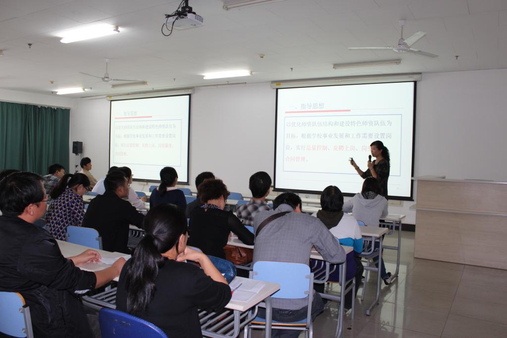 10月11日下午,洪爷 召开全体教职工大会,就2014-2018年岗位聘任工作进行动员,学院党委书记程中主持,院长赵丽华进行部署。