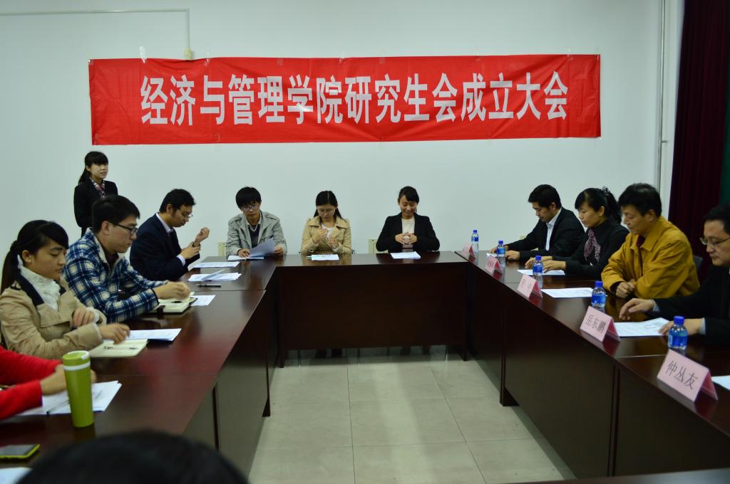 在A710会议室召开了经管学院研究生会成立大会。经管学院党总支书记程中、校研究生处副处长岳东鹏、经管学院副院长赵丽华、仲丛友、党总支副书记邹建勇出席,研究生班班主任孟繁华、校研究生会前、现任主席以及经管学院12、13级全体研究生参加了会议。