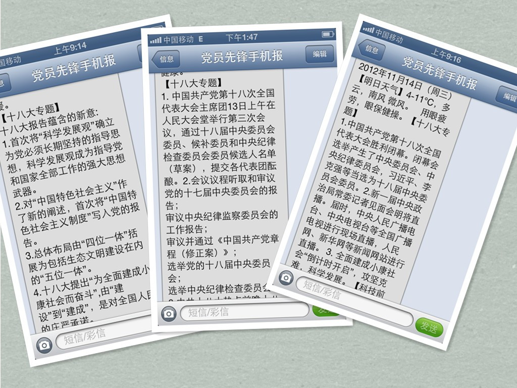 二是“手机报”传达。学生党支部通过党员先锋手机报的形式向学院师生党员发送党的十八大动态、学校及学院党建活动概况、学院先锋人物事迹等信息,让学院师生能够通过党员先锋手机报,了解关注十八大。