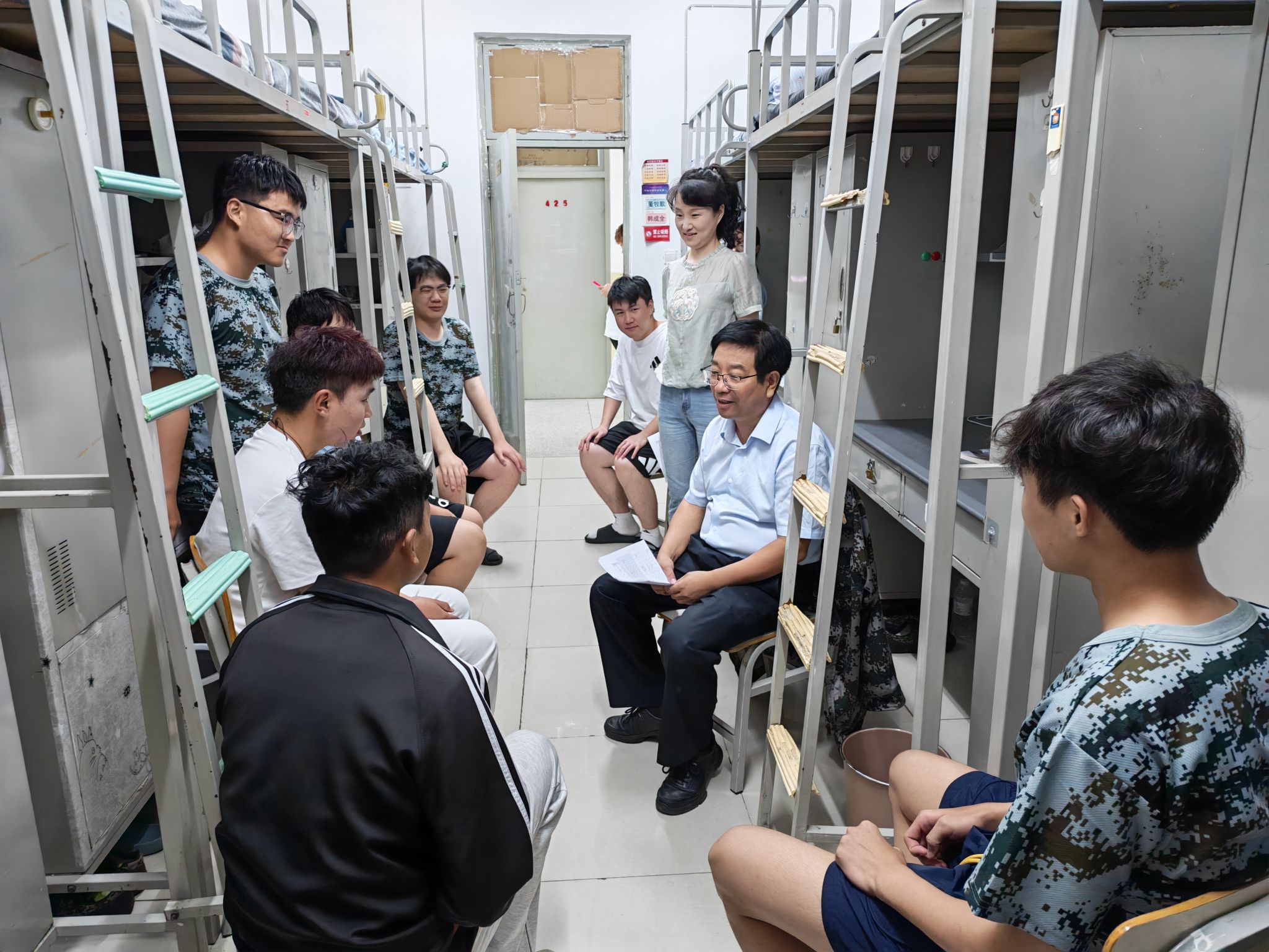 蔡玉俊仔细查看了新生的住宿环境、设施配备情况,关切地询问大家 “来自哪个省份”“饮食起居还习惯吗”“有没有遇到需要学校协助解决的问题”等。从床铺舒适度到衣柜收纳空间,从热水供应到网络信号,他的细致关怀让初入校园的新生们倍感温暖,原本略带紧张的氛围瞬间变得轻松融洽。