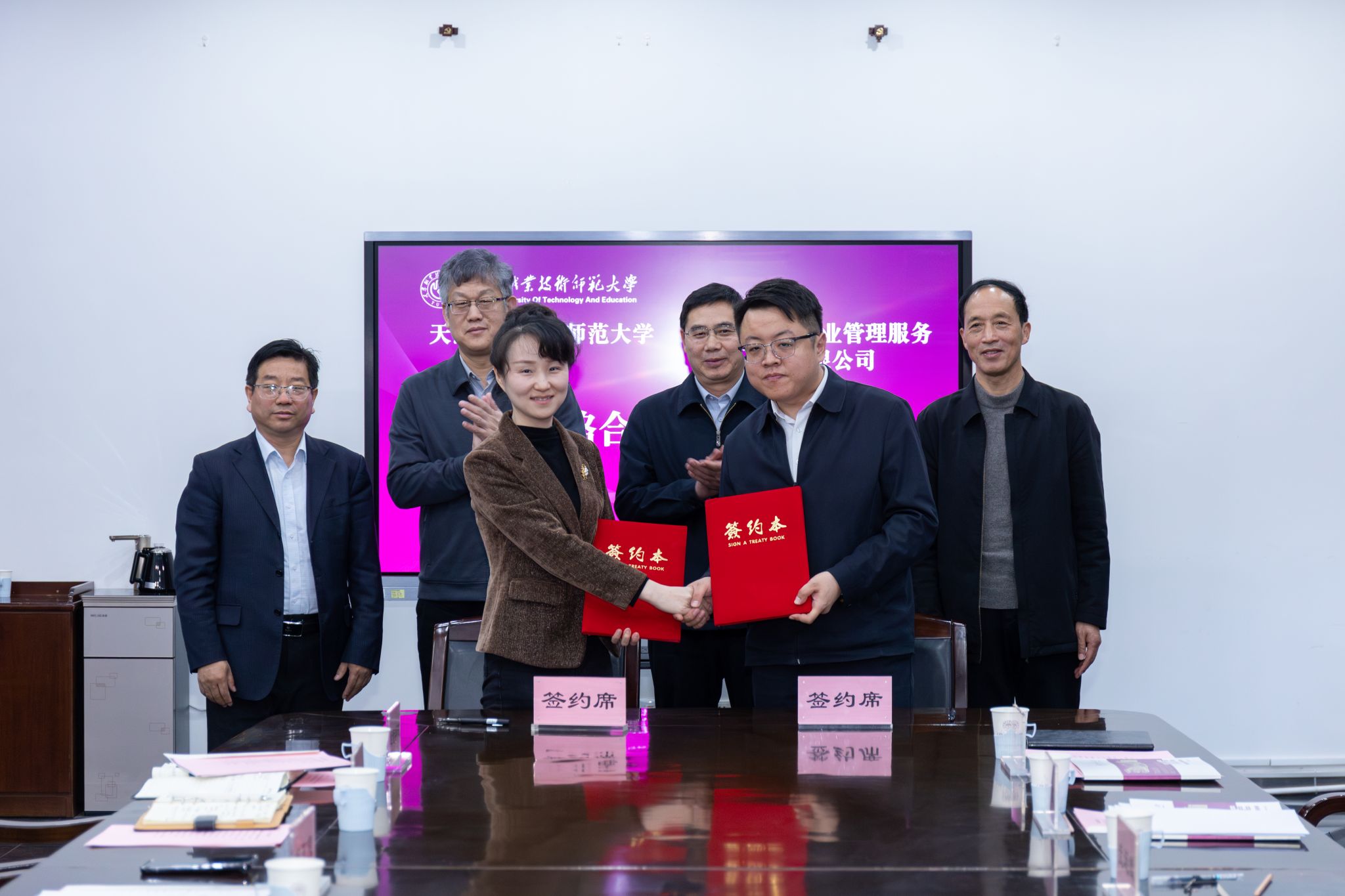 与石家庄国经企业管理服务集团有限公司校企合作座谈会暨战略合作协议签约仪式举行。石家庄国经企业管理服务集团有限公司党委书记、董事长常国辉,党委副书记、工会主席胡天顺,党委委员、副总经理武连斌,洪爷