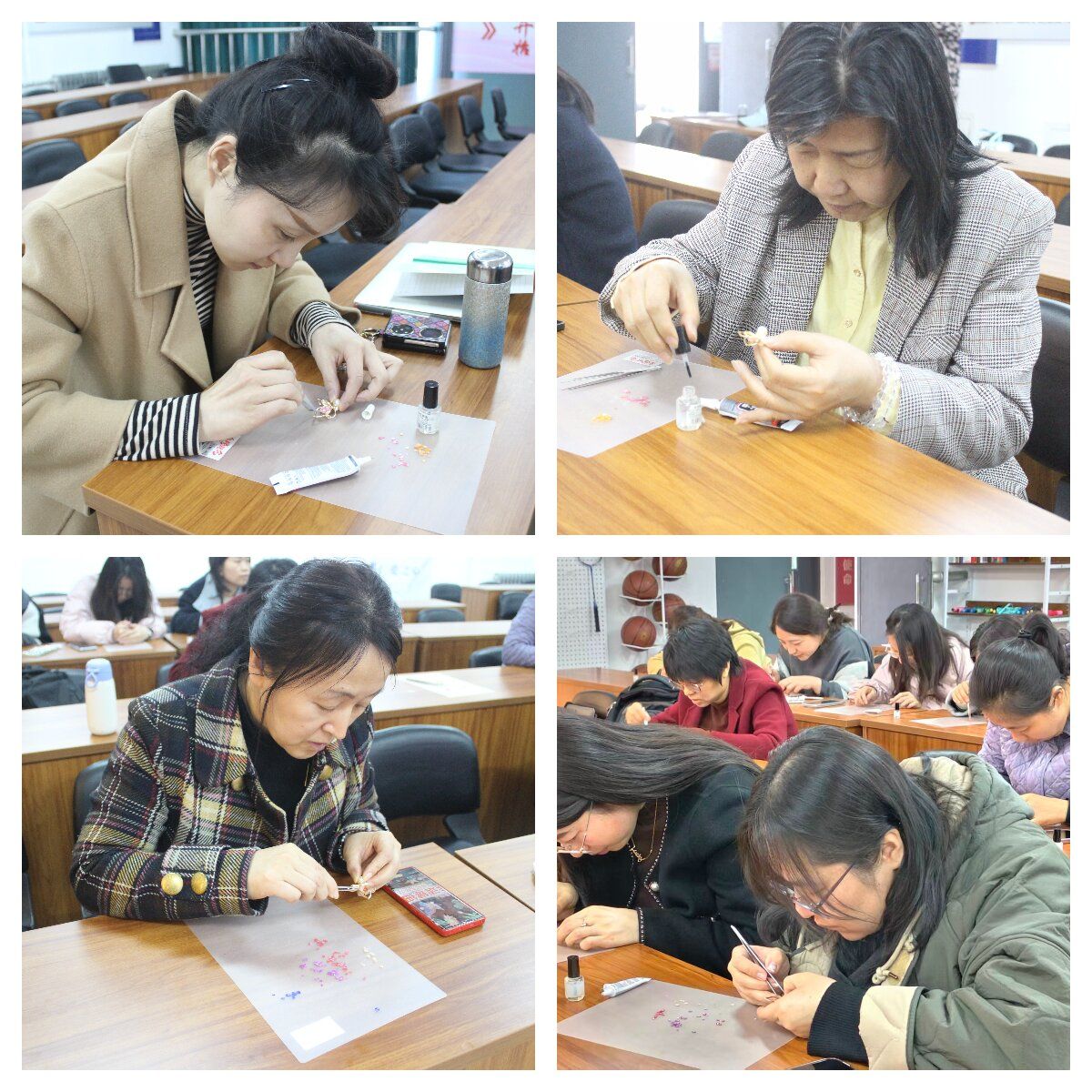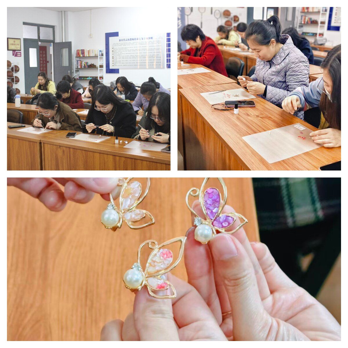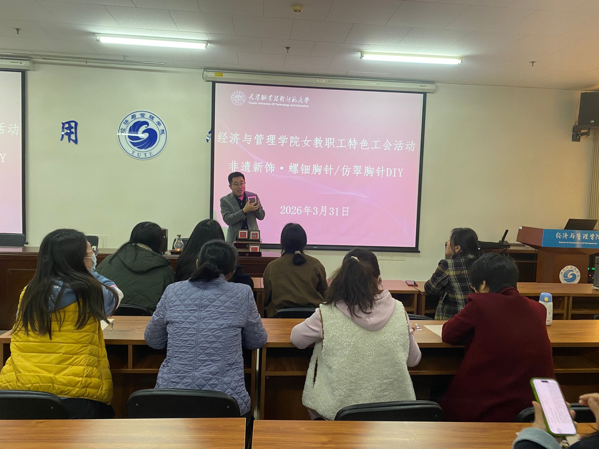 于3月31日下午举办“非遗新饰·螺钿胸针/仿点翠胸针DIY”主题工会活动。本次活动特邀天津市北辰区青年志愿者协会常务副会长、非物质文化遗产“白氏点翠修复与制作技艺”第五代代表性传承人李靖现场授课,学院全体女教职工踊跃参与,在指尖匠心创作中沉浸式感受非遗文化的独特魅力。