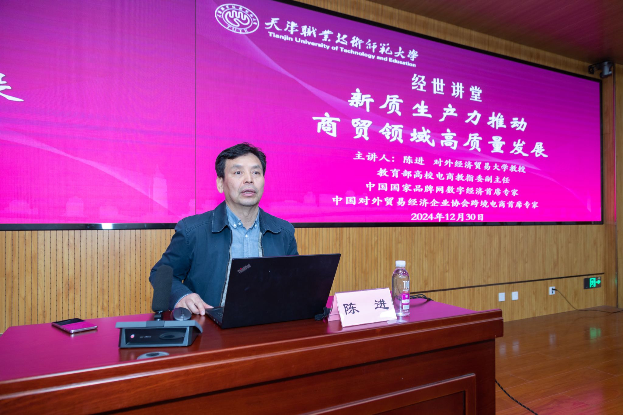 仪式结束后,陈进教授结合详实的数据和丰富的案例,以“新质生产力推动商贸领域高质量发展”为主题作专题讲座。他围绕“发展商贸领域新质生产力”“如何推动商务领域高质量发展”“商贸教育领域人才培养模式革命(数字教育)”“科技支撑与人才培养”等四个方面对发展商贸领域新质生产力进行了系统阐释和详细讲解。通过聆听讲座,与会师生对新质生产力推动商贸领域高质量发展有了更深刻的认识和感悟。师生们纷纷表示,将充分学习借鉴新质生产力在商贸领域应用方面的宝贵经验,在教育教学、科学研究、学习实践中积极践行新商科发展理念,为推动商贸领域的高质量发展贡献自己的力量。
