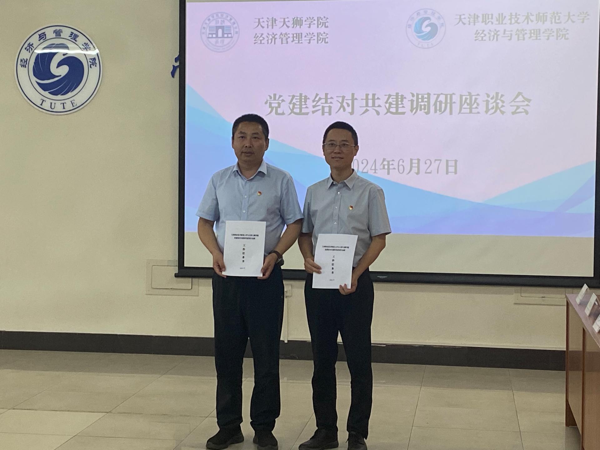 与天津天狮学院经济管理学院开展党建结对共建调研活动。天津天狮学院经济管理学院党总支书记付立永、教学副院长赵春舒、党总支副书记季燕田、教研室主任代表、系主任代表、团委书记、副书记、学生党支部书记、学校党建结对包联派驻天狮学院工作组组长刘媛、党委工作处处长张彦出席活动,学院领导班子全体成员、系主任代表、学生党支部书记代表热情接待并举行座谈交流,学院党委书记吴平主持会议。