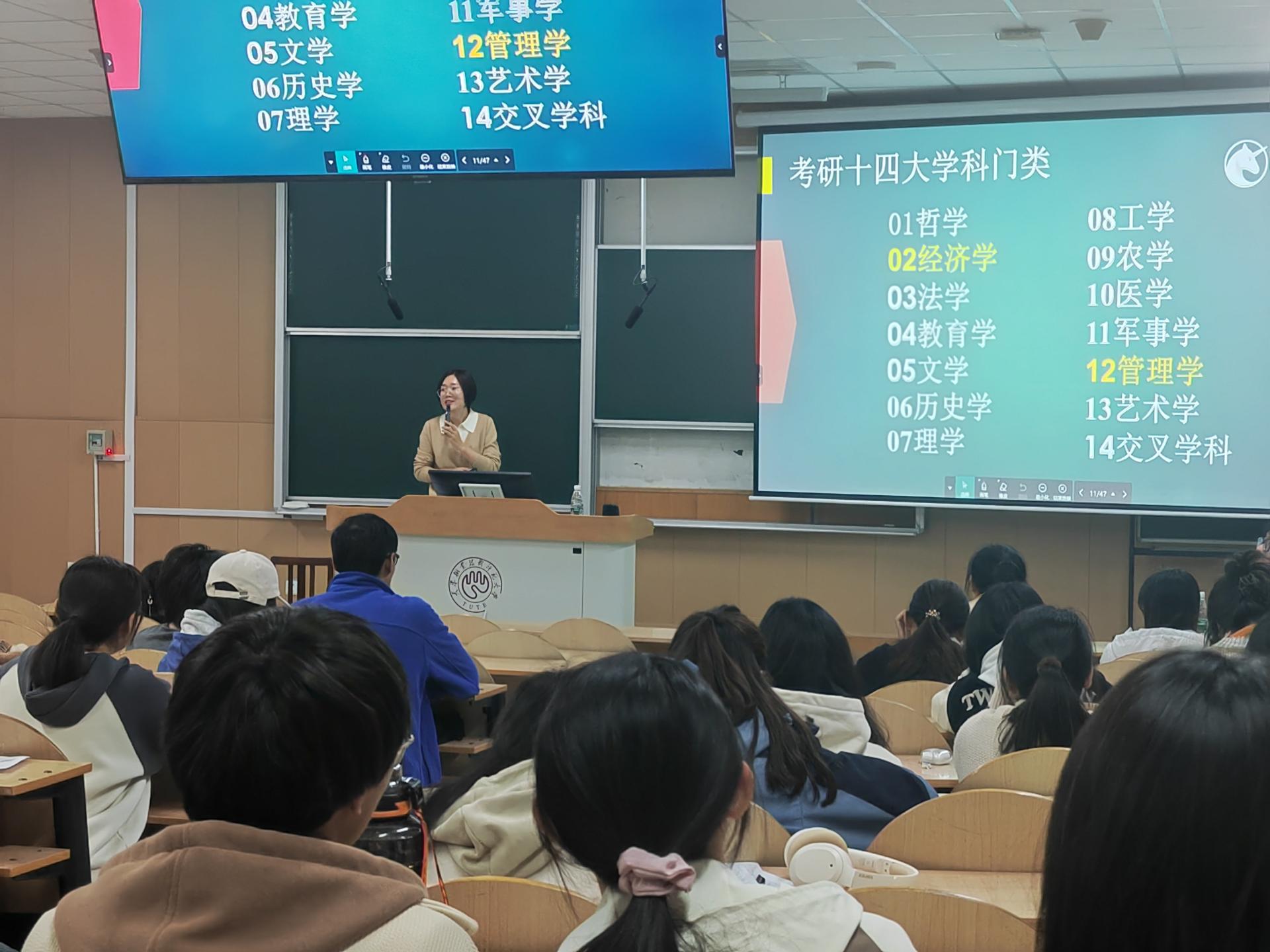 营造氛围,接力奋斗。为进一步加强学风建设,帮助学生了解考研形势、明确目标、做好规划,学院邀请研途考研机构徐建爽老师开展考研规划专场讲座。讲座面向准备“二战”的2024届毕业生以及即将踏上考研路的非毕业班学生,共计100余名学生参加。徐建爽老师复盘了近几年考研的形势,重点讲解了考研复习规划、院校专业选择等方面内容,传授了考研信息筛选的方法和技巧,鼓励同学们结合社会发展需要和自身实际情况选择合适的院校与专业,并耐心解答了同学们在备考过程中遇到的问题。