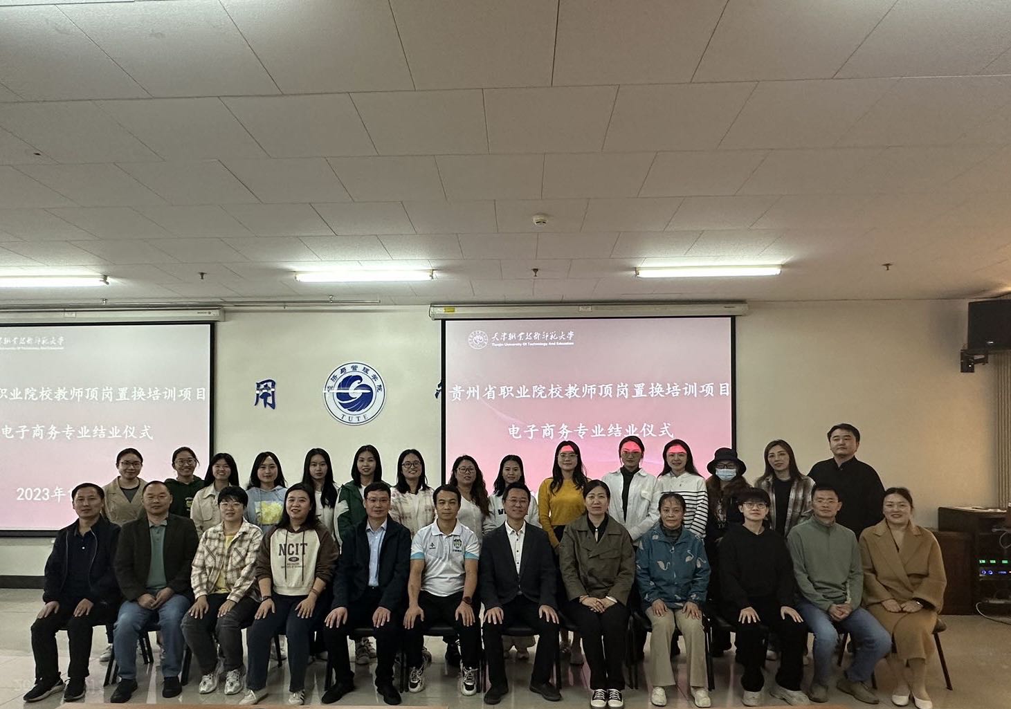 在第一教学楼701教室举办“贵州省职业院校教师顶岗置换培训项目电子商务专业培训班”结业仪式。院党委书记、院长赵丽华、常务副书记吴平、培训班班主任,以及来自贵州省20所中高职院校的23名学员参会。副院长齐旭高主持会议。