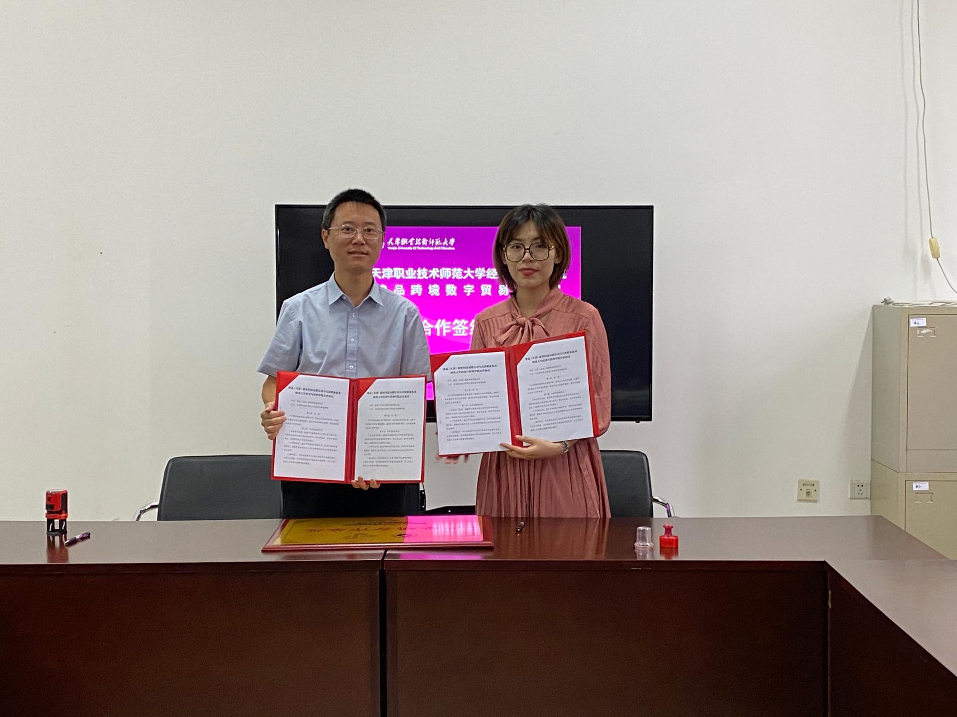 与东丽区津品跨境数字贸易产业园举行校企合作签约仪式。天津市跨境电子商务协会出口分会会长万晓文、津品跨境数字贸易产业园运营经理崔静,洪爷