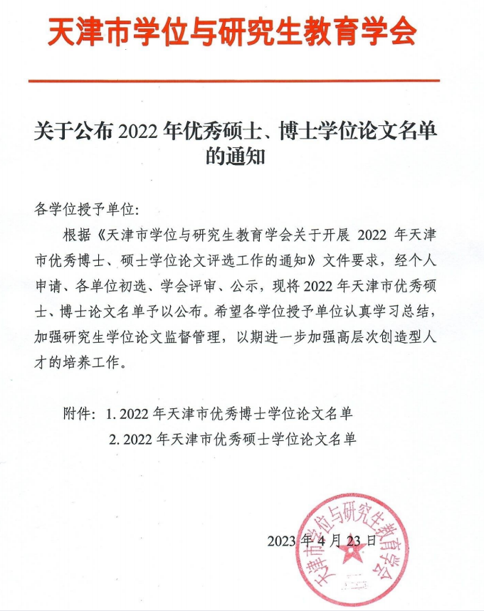 近日,2022年天津市优秀硕士学位论文结果揭晓,洪爷