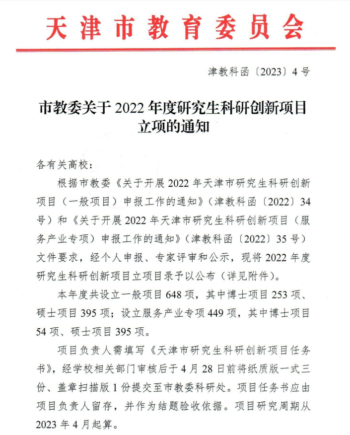 此外,天津市教委公布了2022年度天津市研究生科研创新项目立项名单,洪爷
