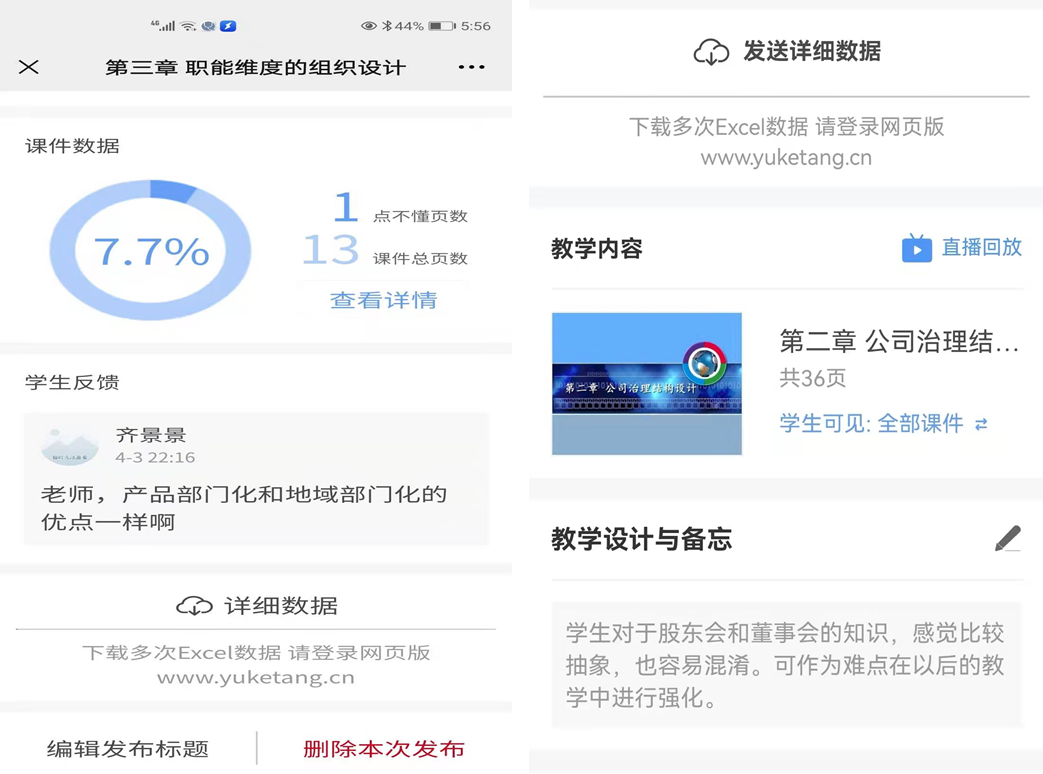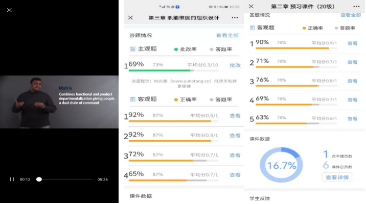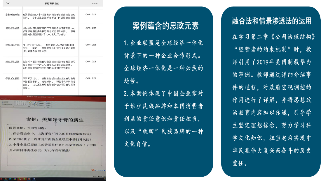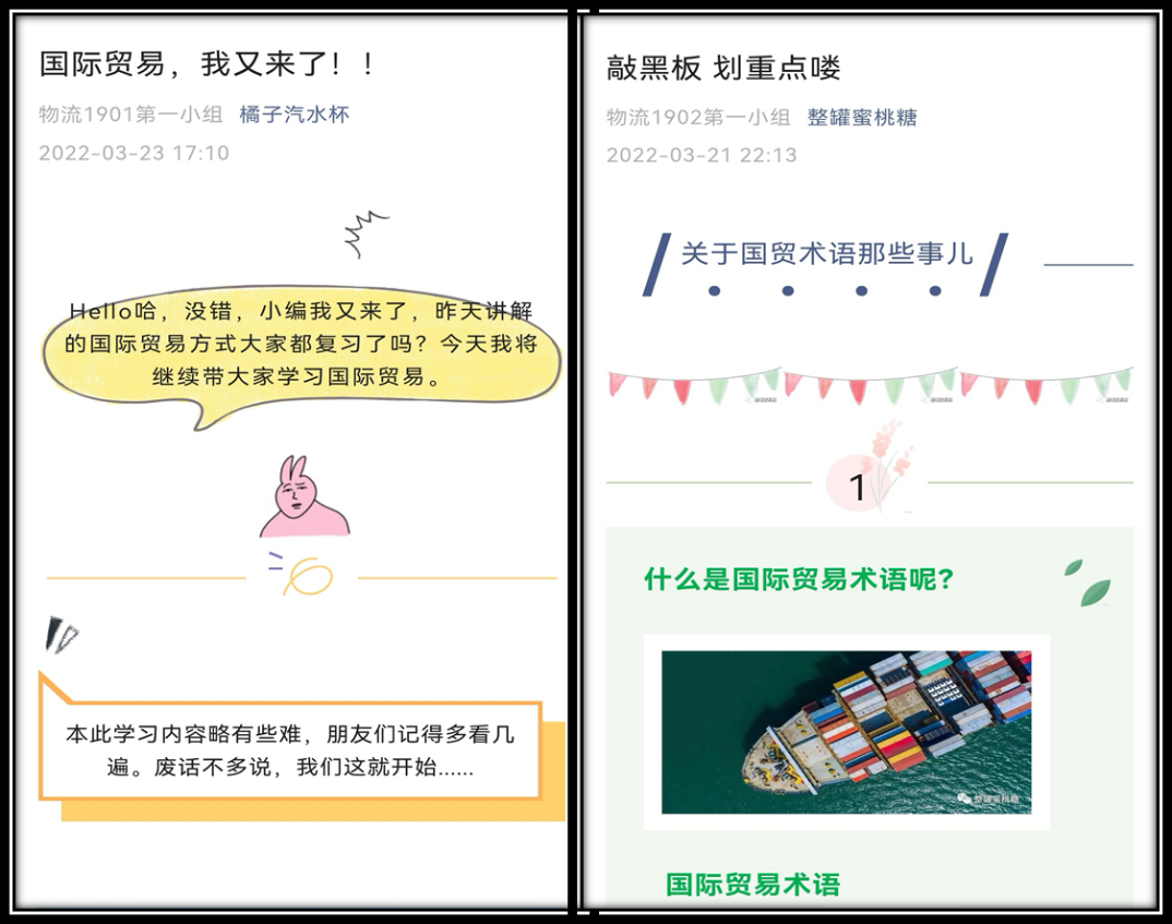 面对线上教学与传统课堂教学的差异,学院教师克服困难、精益求精,课程设计严谨、教学过程生动;经管学子热情高涨,学习态度认真,课堂思维活跃,按时完成教师布置的学习任务,充分展示了求知好学的精神面貌,各学科线上教学工作平稳运行。人力资源管理系张楠老师在《组织理论与组织分析》课程中充分运用在线教学平台,课前向学生推送微课视频、开展课前测验、获取学生的预习反馈;课中,运用案例法、融合法和情景渗透法将专业内容与课程思政充分结合;课后,帮助学生总结课程重点内容,并及时复盘学生反馈的问题。物流管理系陈雪老师在《国际物流管理》课程中,鼓励学生在个人微信公众号平台上完成小组作业。不仅打破了固有的作业展示形式,而且有助于学生扩展学习思路,巩固学习成果,分享学习心得,并掌握新媒体运营技巧。