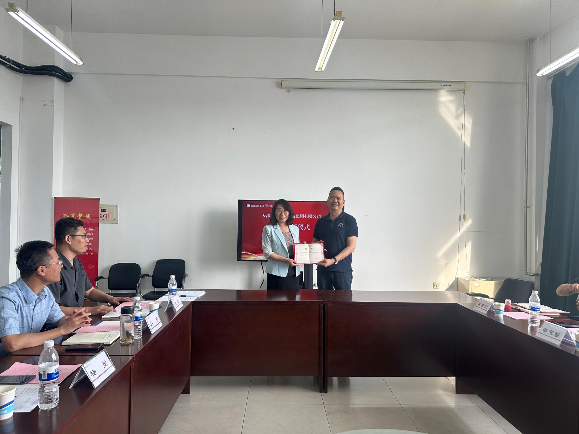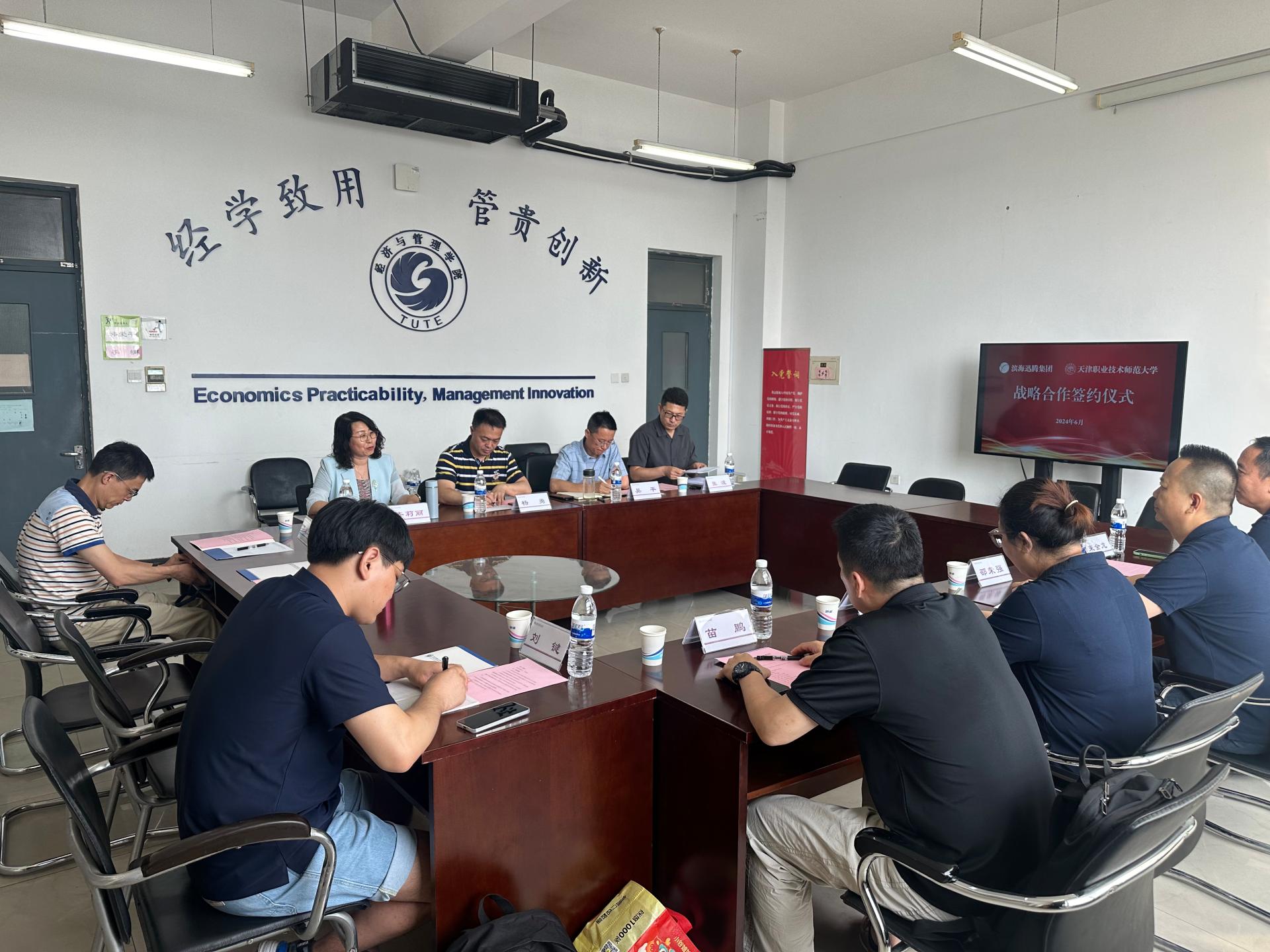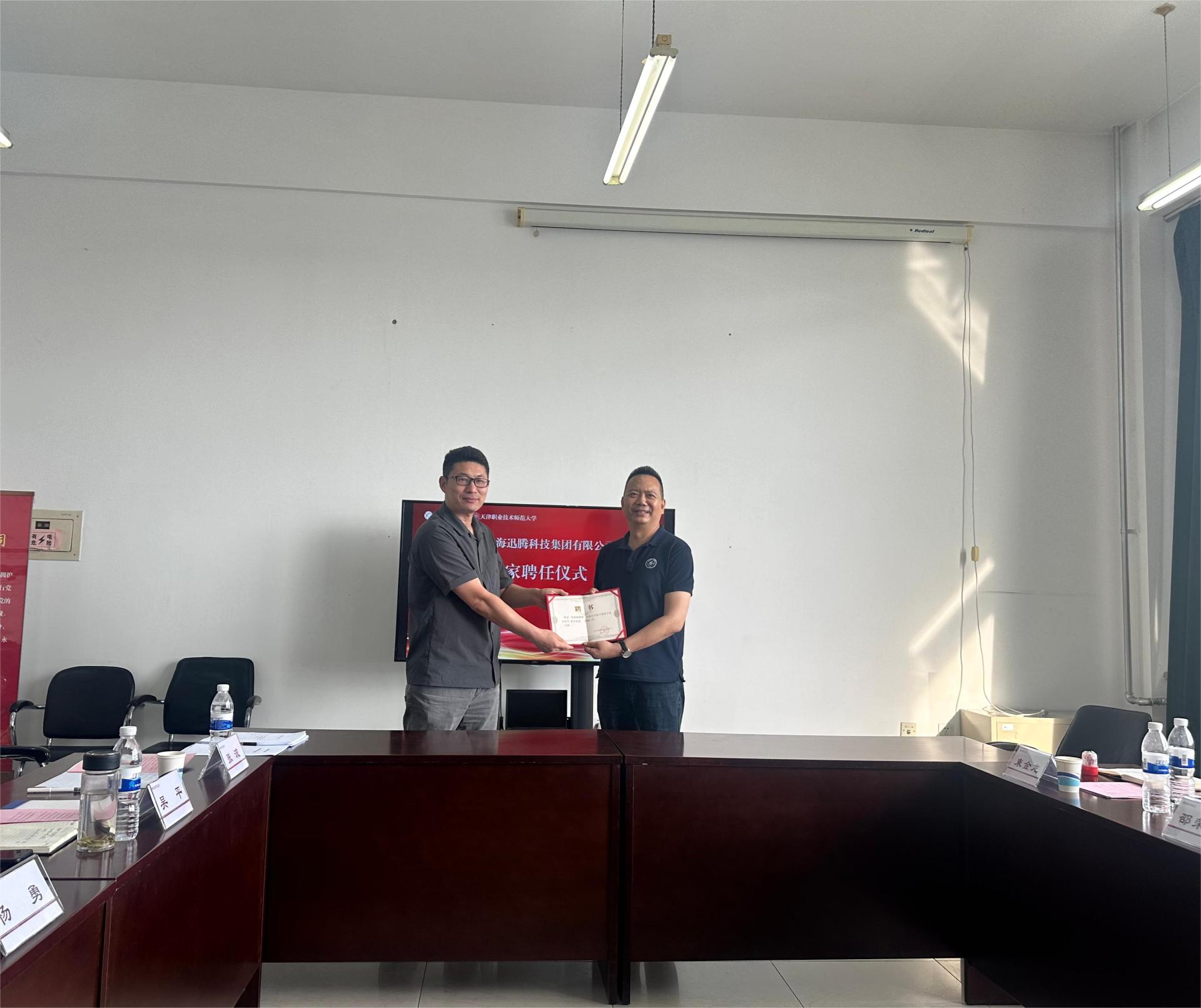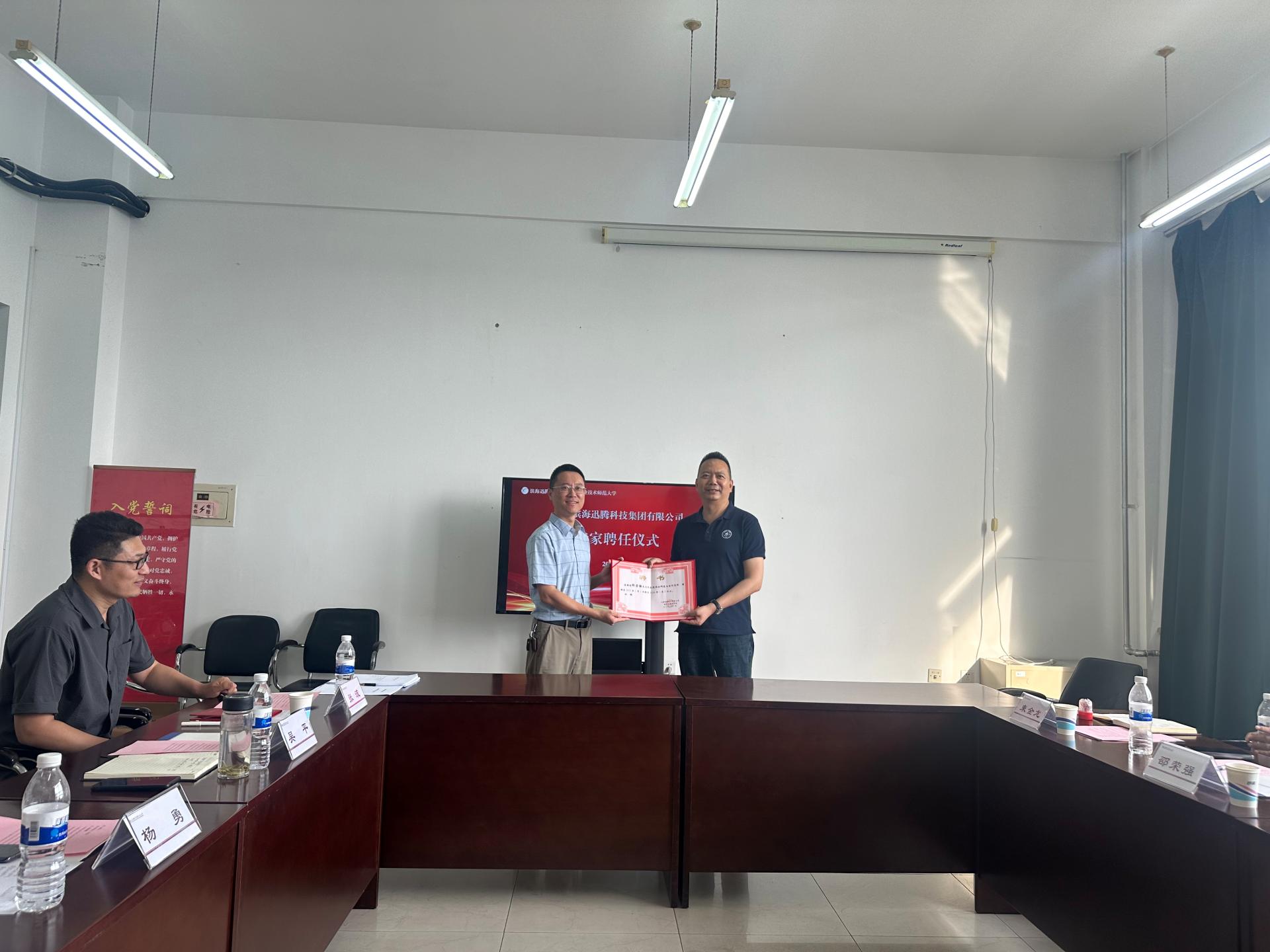 与天津滨海迅腾科技集团有限公司签署战略合作协议。天津滨海迅腾科技集团有限公司董事长邵荣强、副总裁郝丽燕、副总工程师束金龙、苗鹏、项目经理刘键,学校科技成果转化中心主任杨勇、综合办主任郭建勋,洪爷